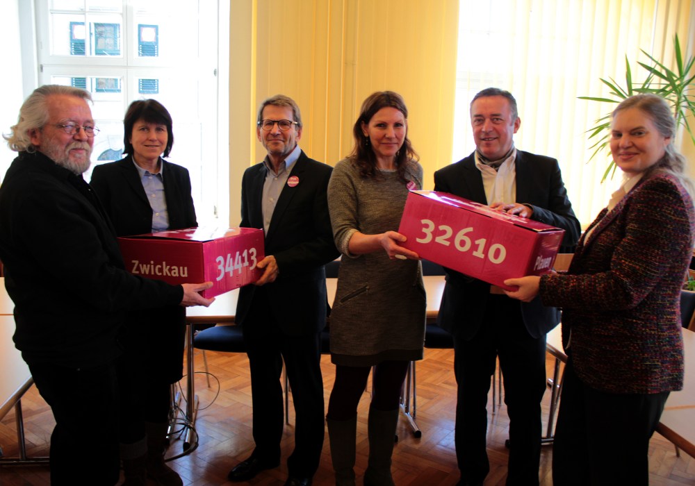 Heute sind in Plauen an die Oberbürgermeister von Zwickau und Plauen, Dr. Pia Findeiß und Ralf Oberdorfer gut 43.000 Unterschriften übergeben worden – vom Bündnis „Pro Theater Plauen-Zwickau“. Das breit angelegte Bündnis – von Vereinen und namhaften Bürgern in erste Linie getragen – freute sich über die große Anzahl derer, die eine Online-Petition und deren analoge Schwester unterzeichneten. Auch wenn die Stimmenaufteilung ein wenig merkwürdig ausschaute – die analog abgegebenen Stimmen wurden beiden OBs überreicht, die Online-Stimmen nur dem der jeweiligen Stadt – ist das Zeichen deutlich: Die Menschen in Südwestsachsen wollen ein produzierendes Vier-Sparten-Theater und keinen bespielten Musentempel. Den klarsten Kernsatz des Tages sagte Theater-Fördervereinschef Lutz Behrens: „Die Schauspieler sollen hier bei uns wohnen und ansprechbar sein. Sie sollen identitätsstiftend für unser Theater sein.“